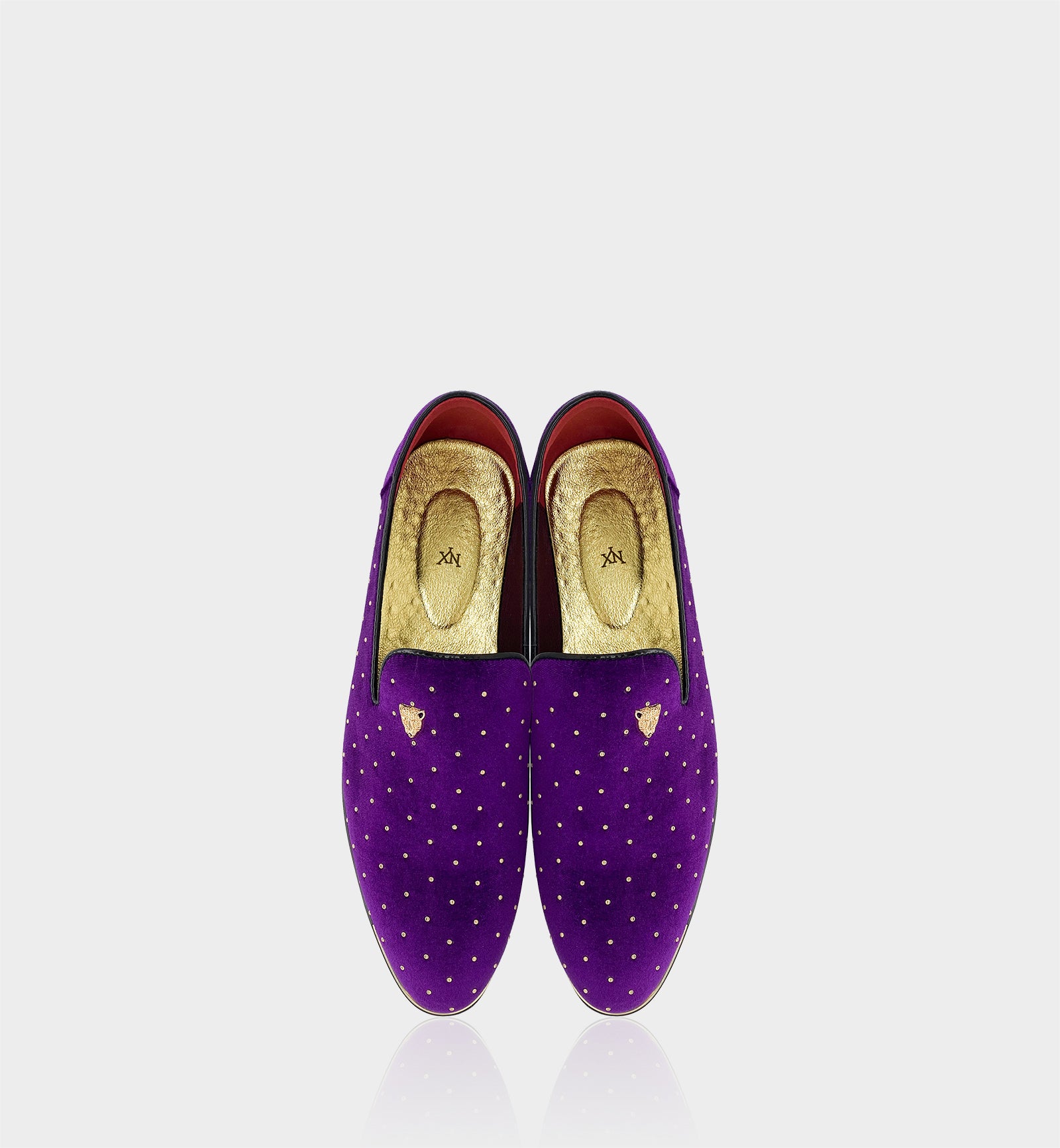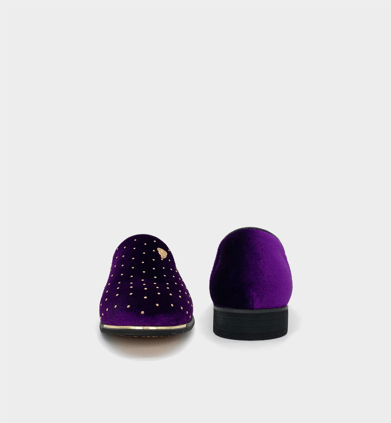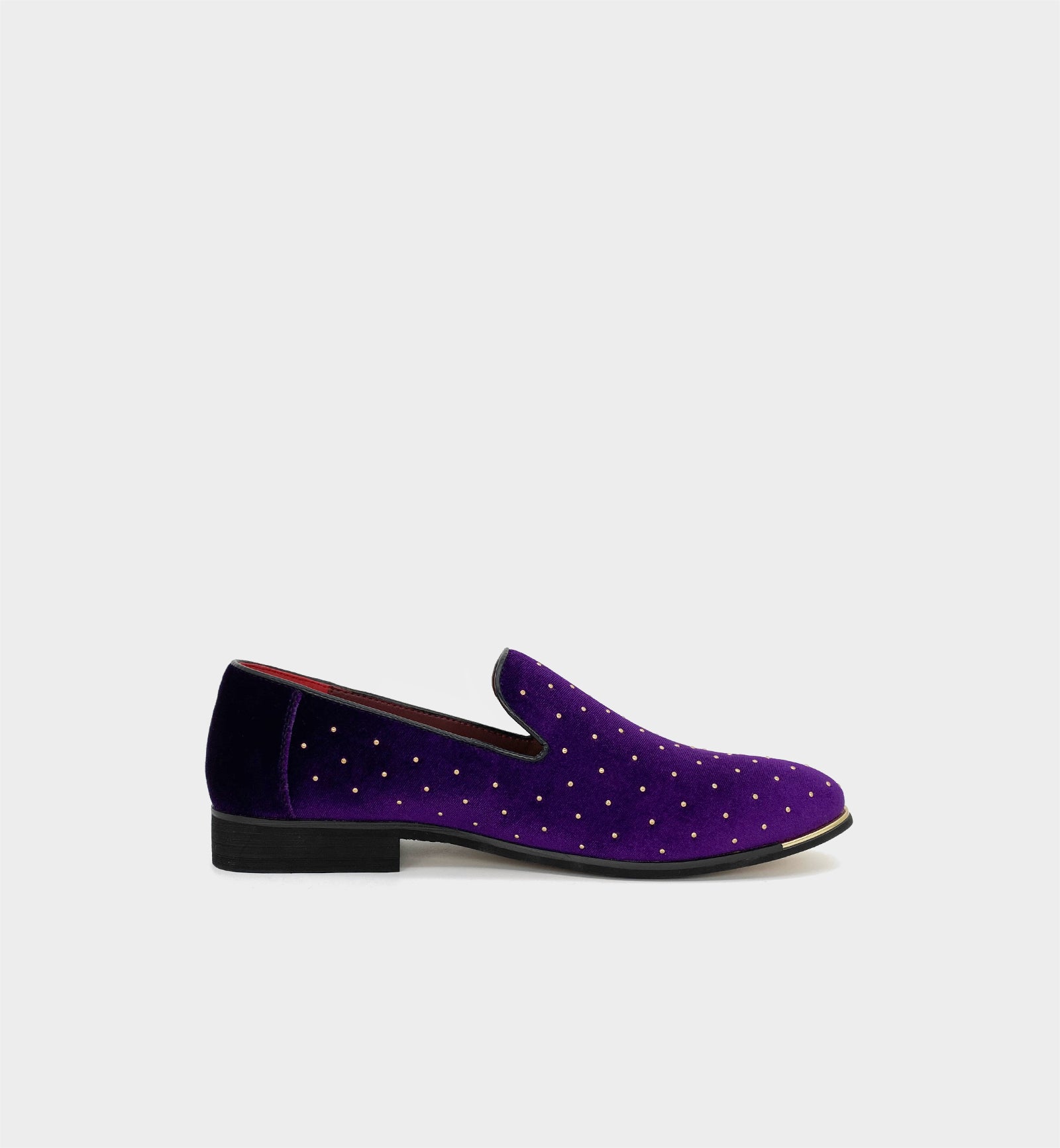 Crafted from high-grade velvet upper, paired with gold rivet details and exclusive brand metal emblem, the elegant purple and gold combination creates eye-catching texture, while the pointed-toe silhouette is sleek and elegant—fitting both the luxurious style of dinners and parties, and adding a unique touch to daily light business outfits. The shoe features a non-slip and durable rubber outsole, providing stable traction and long-lasting wear; the interior is equipped with a removable cushioned insole, lightweight and breathable for all-day comfort. The slip-on design enables easy on-and-off, and the leather lining enhances the light luxury experience. Whether for elevating formal looks or breaking through daily style, these loafers are a preferred item for men to showcase unique taste.
